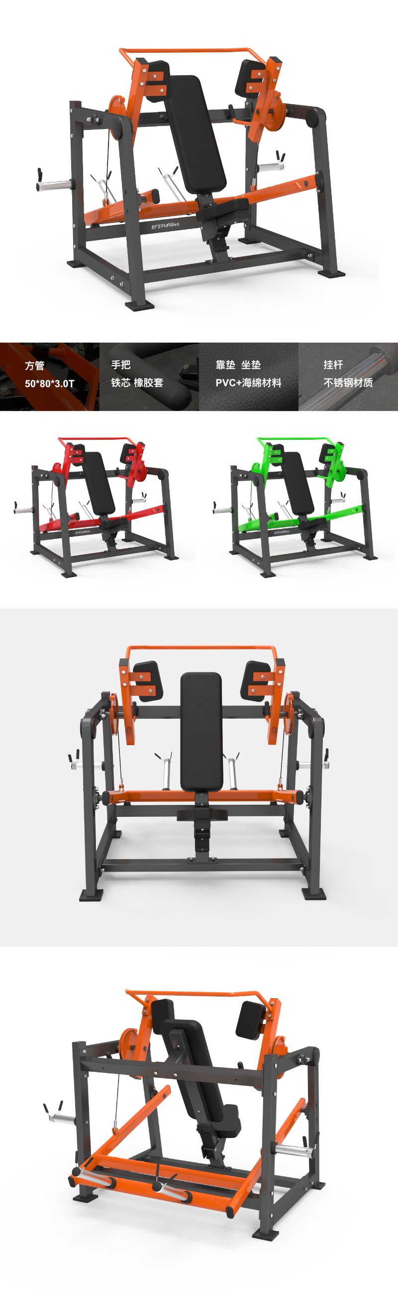 BFT-E21 BFT-E21 臂下壓背肌訓練器 尺寸:1930x1700x1500mm 凈重:158kgs 主管:方管50*80*3.0T 手把:φ25 鐵芯+TPV橡膠套 靠墊/坐墊:PVC+海綿材料 掛桿:不銹鋼材質 最大承重:300kg 獲取報價